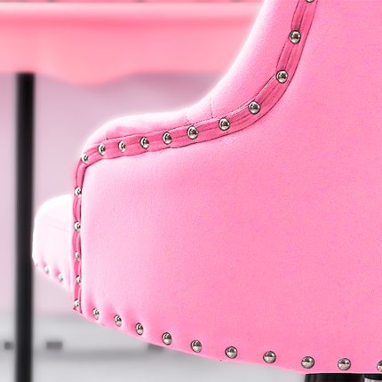 Silla ergonómica ajustable en capitoné de color rosa. Perfecta para el uso diario en el puesto de trabajo, ya que se ajusta y regula a tu peso y altura. Permite una fácil y cómoda movilidad gracias a sus ruedas rotatorias 360º.